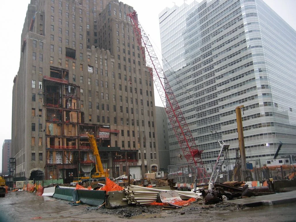 The skyscraper was in the path of destruction on 9/11, bordering the northern edge of the World Trade Center campus with close proximity to the Twin Towers, and next door to the collapsed 7 World Trade. Luckily, the building's thick masonry exterior helped to shield it from much of the falling debris and absorb the energy from the collapsed towers with no interior fires. Still, the building experienced extensive damage with entire portions of the facade ripped off its steel skeleton. The underground Verizon cable conduits and infrastructure were also flooded and heavily damaged. In 2002, the New York Times detailed the damages to the building: βIt took hits on two sides. First, the steel hurled from the collapsing towers smashed into the building's south face, penetrating an underground vault containing thousands of telephone cables. Later that day, 7 World Trade Center, a 47-story skyscraper just to the east, came tumbling down, its ruins slumping like a slain giant against the Verizon Building's east facade.The remains of the collapsed trade center buildings have been picked away, but the wounds they created are still visible. Two-foot-wide steel support columns at the east facade of the Verizon Building are bent inward like crumpled car fenders. A hole in this face of the building reaches as high as eight stories from the ground, and is covered by nothing more than white sheeting.β