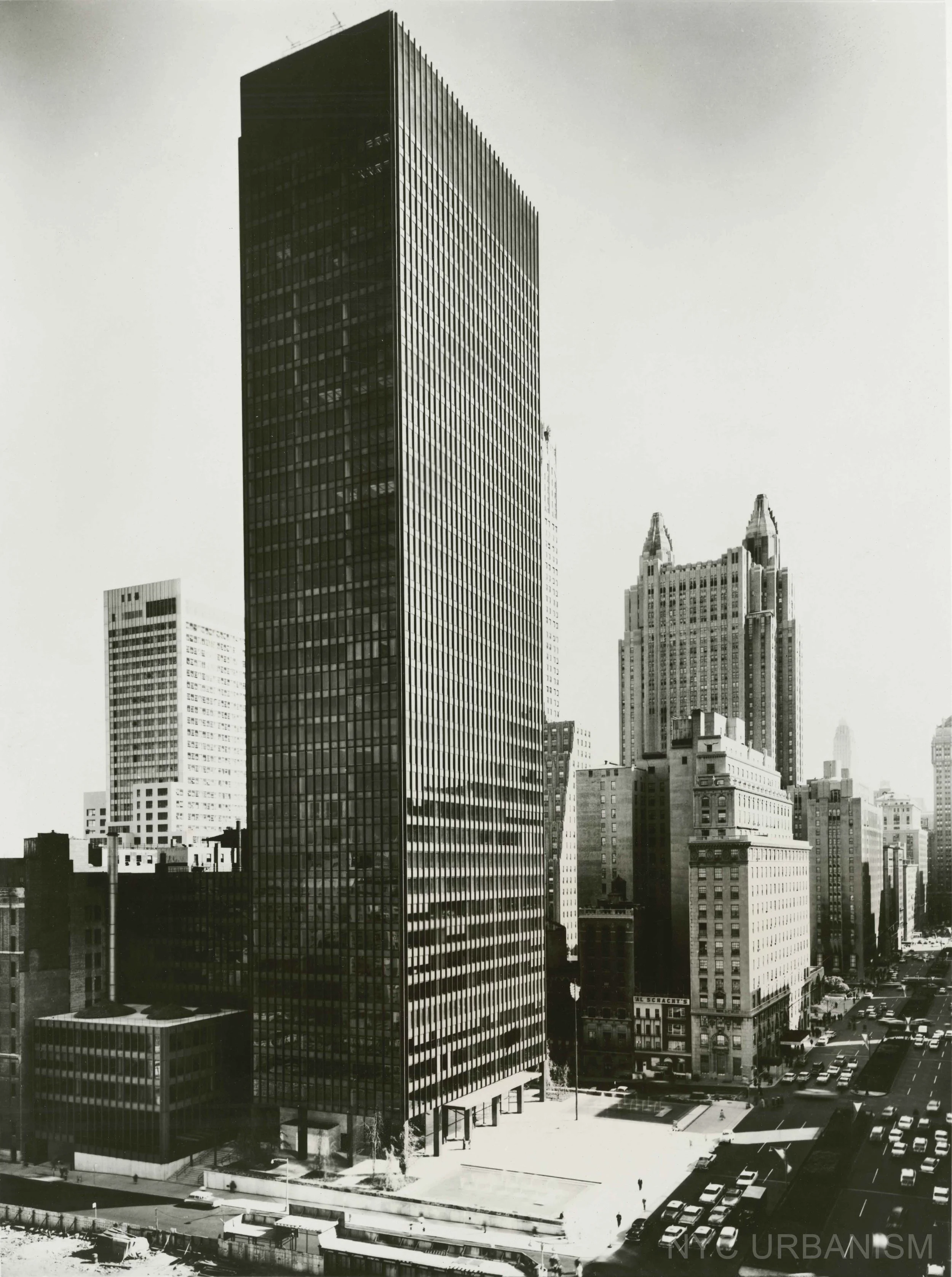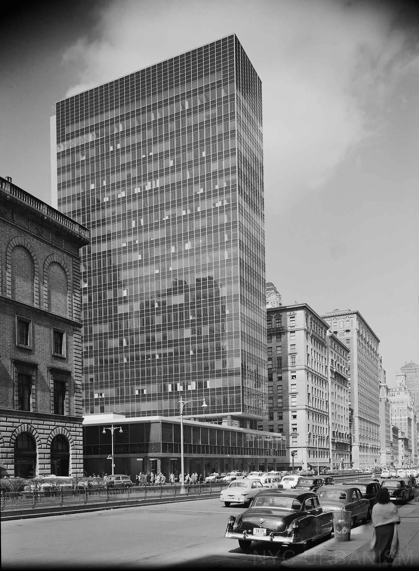 Park Avenue is a nexus of Corporate Modernism with its sleek midcentury glass curtain wall towers. Lever House, designed by SOM’s Gordon Bunshaft and Natalie de Blois features the city's first building wrapped in a glass curtain wall. Built in 1952, the building was a divergence from previous office towers that were clad in masonry with setbacks as mandated in the 1916 zoning resolution. To construct a slab tower without setbacks, Lever House only occupied 25% of the site, leaving the remaining space open to the public.