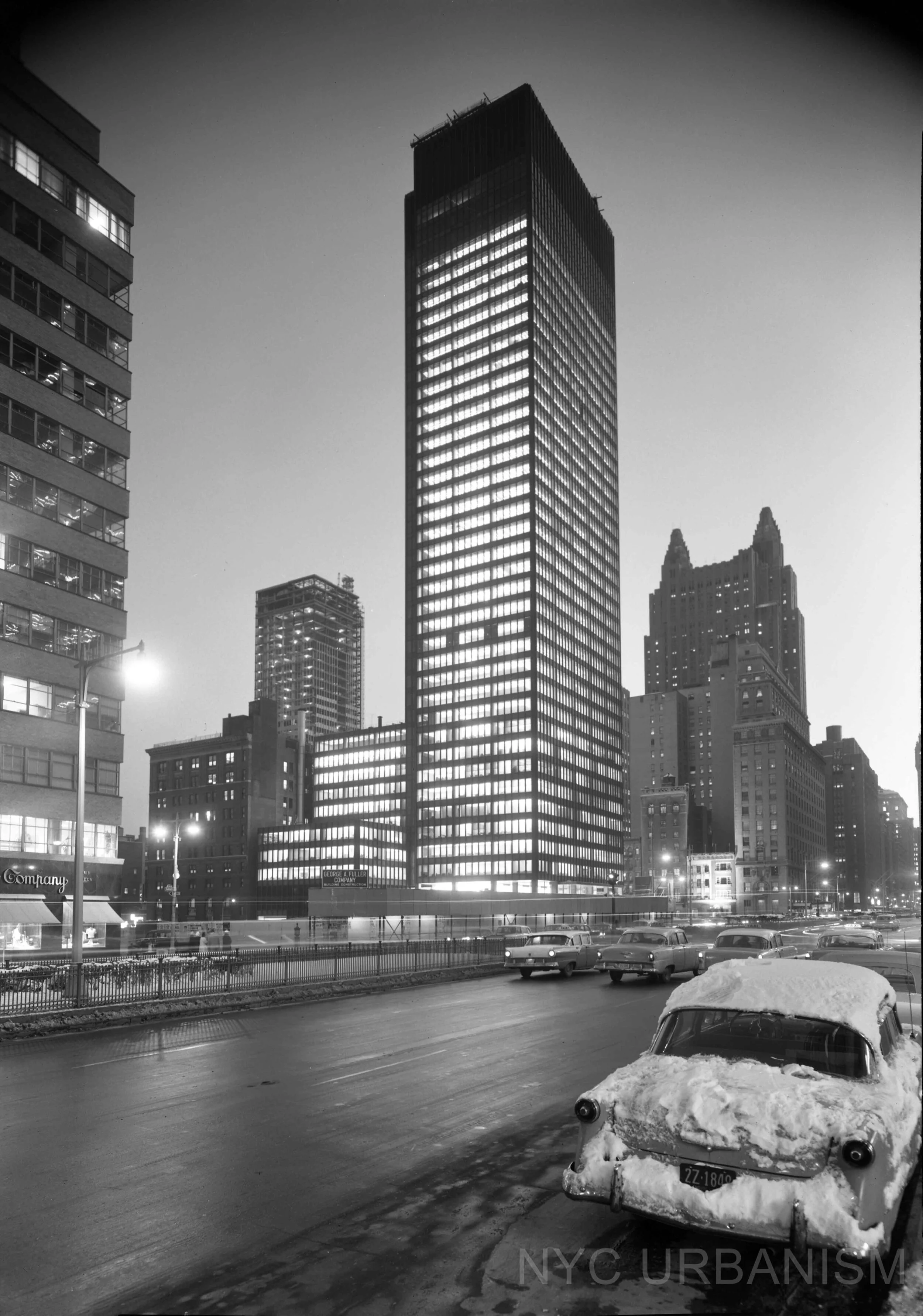 In 1958 Mies van der Rohe’s Seagram Building followed this form, occupying only 40% of the site with a grand public plaza, reflecting the post-war planning ideology of towers surrounded by open space. Generally regarded as the finest example of the International Style, Seagram would influence a generation of modernist mid-century skyscrapers. Three years later a major zoning resolution would incentivize this style by offering bonuses for public amenities like open space and regulating floor area, not massing.