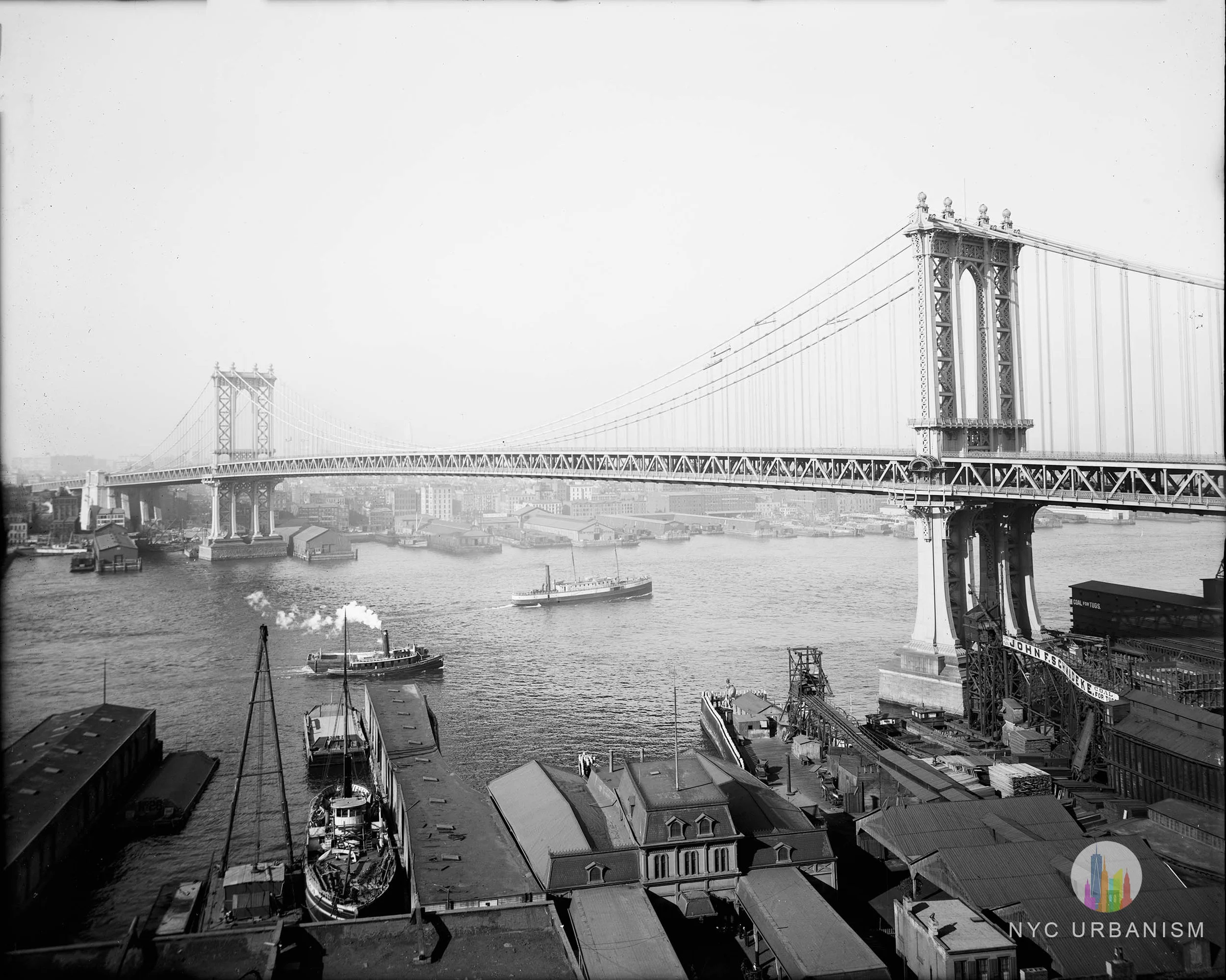 110 Years ago today the Manhattan Bridge opened to traffic. The bridge was the last of the East River bridges to be constructed, following the Brooklyn Bridge (1883) Williamsburg Bridge (1903) Queensboro Bridge (1909). Utilizing a weight-saving Warren Truss, the bridge was the first modern steel suspension bridge and paved the way for future record-breaking bridges. The grand Beaux-Arts arch and collonade entry on the Manhattan side of the bridge was designed by Carrere & Hastings and opened in 1915. On the Brooklyn side, two female figures representing Brooklyn and Manhattan designed by Daniel Chester French flanked the entrance to the bridge. The statues were later moved to the Brooklyn Museum.