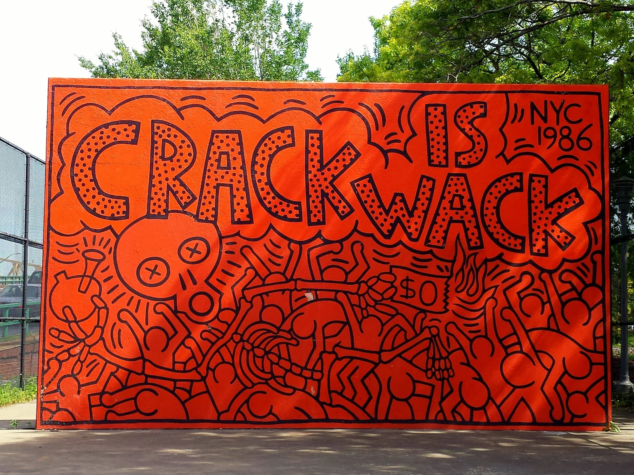 The 1986 mural is actually the second "Crack is Wack" mural to be painted on that site. Originally inspired by Haring's studio assistant who had been struggling with a crack addiction, Haring chose the high publicity East Harlem handball court on 128th and the FDR Drive. After painting the first mural, Haring was arrested for vandalism, then mural was completely painted over in gray by the Parks Department, who later apologized and asked Haring to repaint the mural, eventually naming the park "Crack is Wack Playground" after Haring's death. Today it is arguably the most famous mural in NYC.