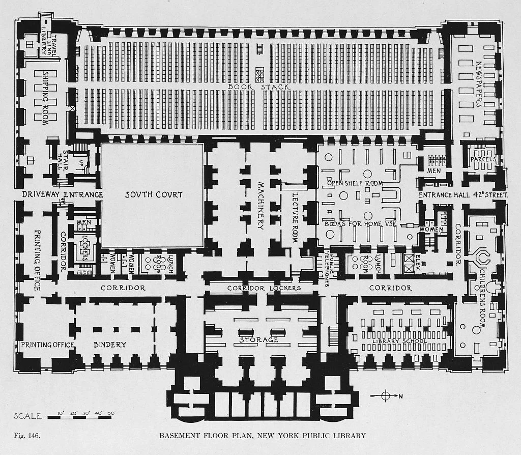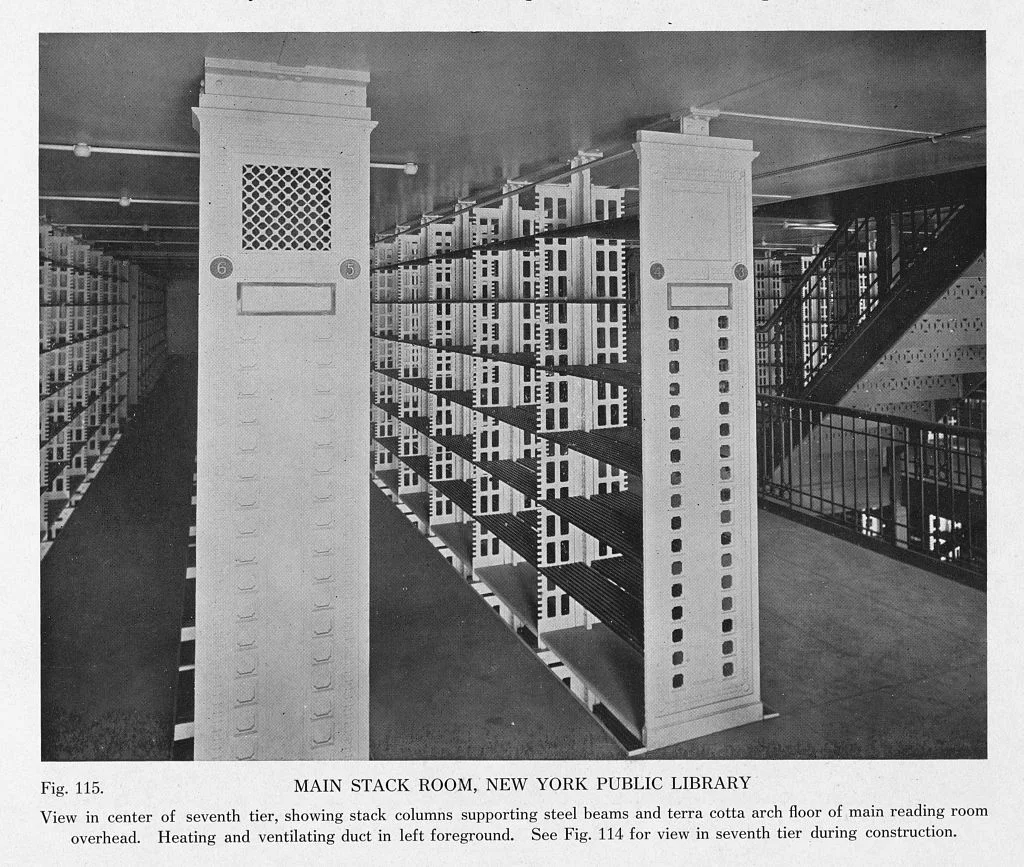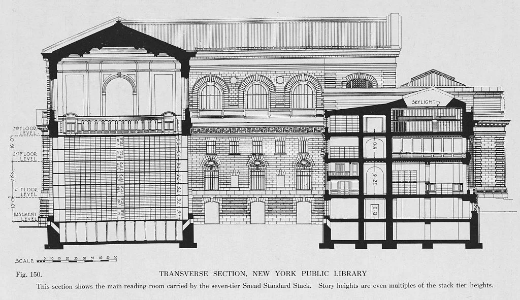 Floor plans, sections, and an illustration showing the stacks at the New York Public Library.