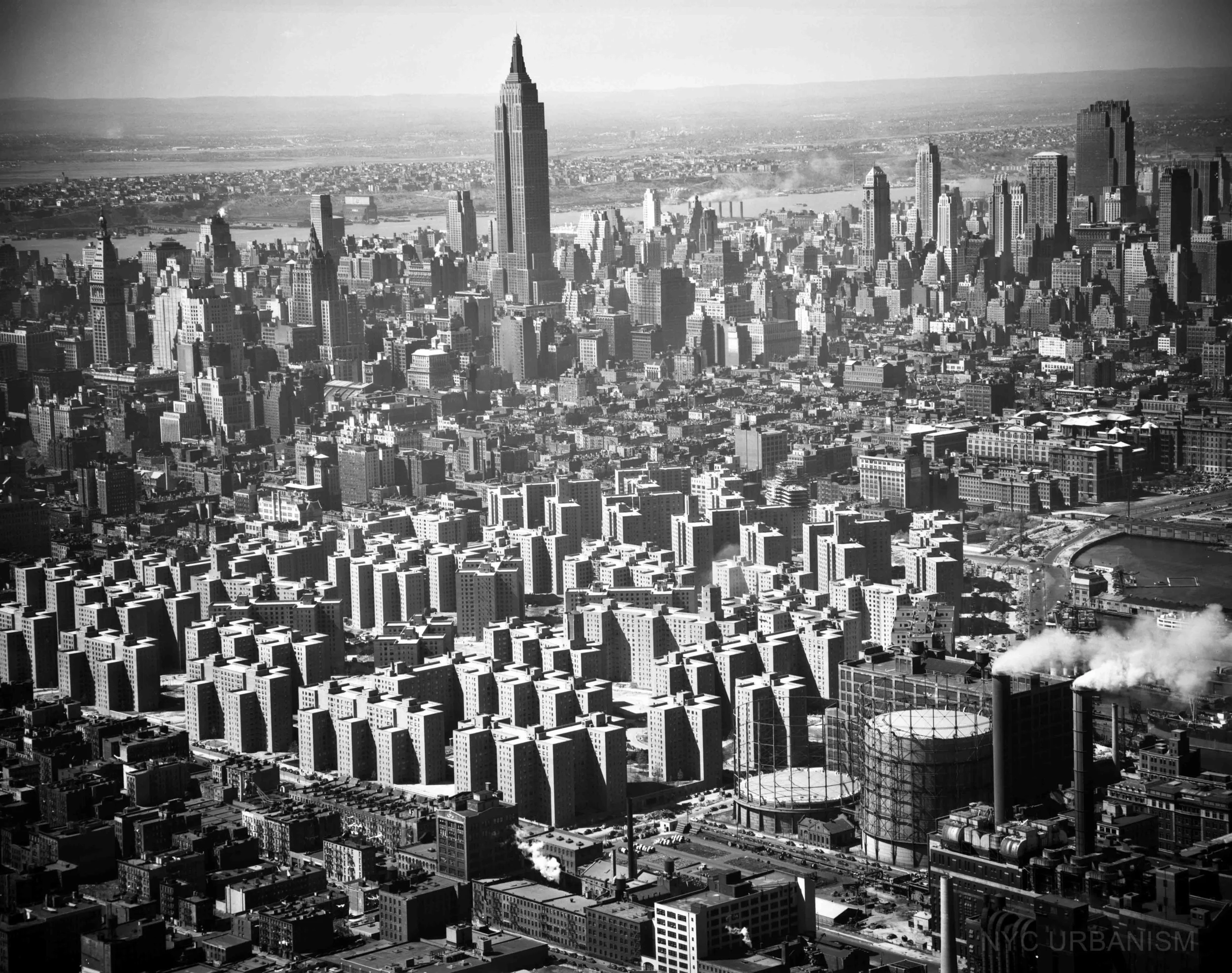 The neighborhood that is now Stuyvesant Town/ Peter Cooper Village was formerly known as the Gas House District, 18 city blocks primarily consisting of walkup tenements, which were declared “blighted” by the city in 1946, making them eligible for slum clearance. The complex was built by the Metropolitan Life Insurance Company, who at the time insured one-third of the city’s population. MetLife developed Stuyvesant Town with the understanding that better living conditions would improve the company’s mortality numbers and therefore annual earnings. Stuy Town was inspired by architect LeCorbusier’s “tower in the park” vision, and its 110 buildings only cover 25% of the property leaving the rest for lawns, pathways, and playgrounds. In addition to reduced land coverage, the development housed only 302 people per acre, a drastic decrease in density compared with 1100 people per acre in Lower East Side tenements in 1900.