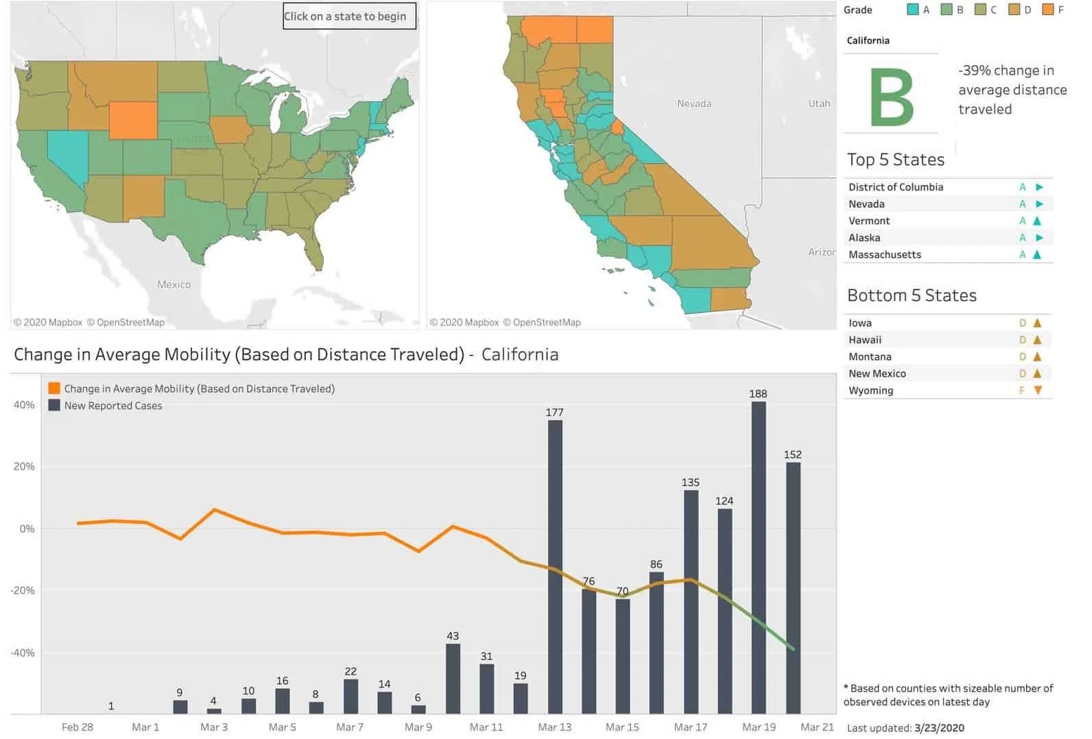 The Social Distancing Scoreboard map compiles cellphone data to track people's change in average distance traveled, a proxy for how well an area is achieving "shelter-in-place." The data is then given a score, A through F, based on the decrease in average distance traveled. This can be viewed by county or state.