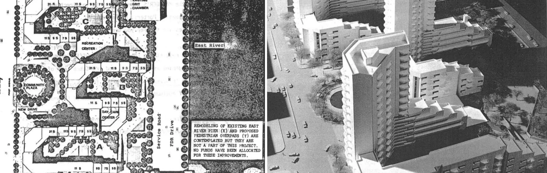 While the buildings may lack elegance, together and apart they form a fitting formal metaphor for the forces that made them possible. Strong geometric expression and forceful massing reflect strength and ambitions of collaborations between organized labor, state and city agencies. The most interesting aspect of the building's design are the arms that step down from towers and wrap around elevated plazas as they descend towards the river. There are many things to unpack when analyzing the design: The present and powerful frontage to First Avenue – while the buildings neither meet the sidewalk or directly relate to the surrounding low-rise buildings or public housing projects – offers a more explicitly urban siting that operates in response to both proceeding forms of housing, mediating the scales of the two typologies into an alternative form that embraces multiple scales of urbanism while maintaining its own autonomy. The towers hug and protect the elevated courtyards, separating them from the surrounding streets; a benevolent intention at the time, which now proves to actually be detrimental and unsafe when removing "eyes from the street" as Jane Jacobs warned against. The paternalism of Mitchell Lama and organized labor is seen through this protective form, with the alignment of the streets hinting that these buildings are part of the city and the residents are part of the surrounding community, but the unions, city, and state are there to provide support. The play of scale from large towers to low-rise stepped portions and down to seating areas of plazas further articulates and embodies the levels of involvement in the project, from state, unions, and city, down to the local community and residents of the four buildings – together they form a strong formal and urban metaphor for the benevolent, maternal/paternal operation of creating housing and communities at different scales within the city that offer both autonomy and solidarity. It is a powerful architectural representation of the possibilities of a social-democratic urban alternative in which power is shared by government, organized labor, communities of different scales, and individual citizens, all working together in solidarity while maintaining individual autonomy.
