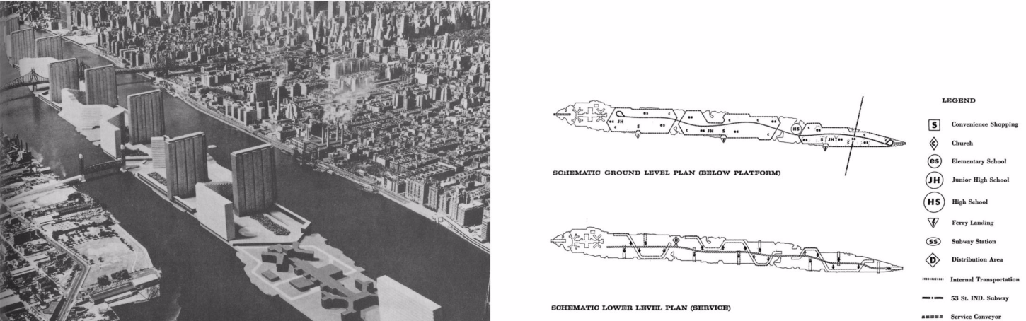 Victor Gruen's platformed proposal for Roosevelt Island, 1961