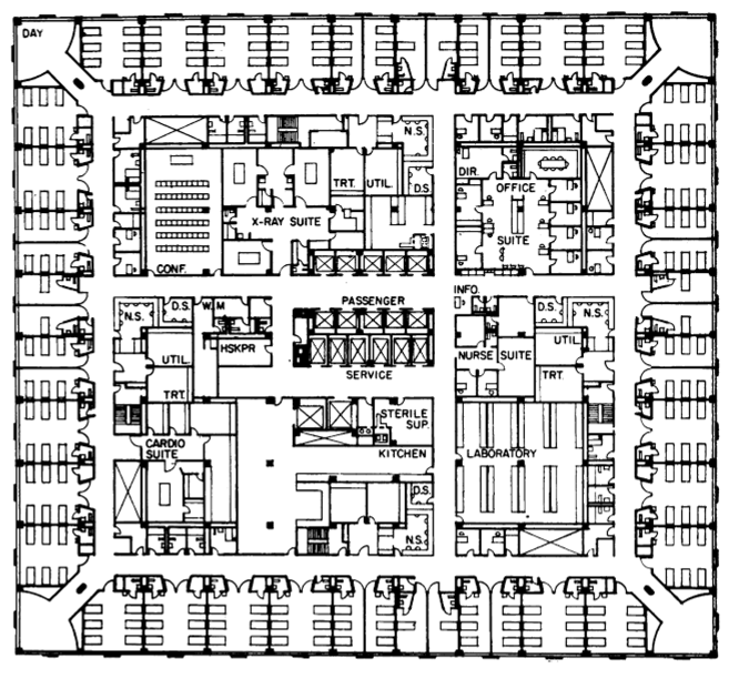 The beige-colored, concrete-clad facade does little to disguise the bulkiness of the building, which has little aesthetic qualities was designed purely with function in mind. With one-and-a-half acres of space per floor, the building encompasses more floor space than Bellevue's entire twenty-acre property. The floor-plans follow a circumferential format, where all 2,000 rooms are positioned around the exterior of the building with the twenty elevators and services such as the laboratories, kitchens, and offices confined to the extensive windowless interior. One reason for adopting this method was to streamline traffic patterns of patients and staff vertically. The previous horizontal layout of the hospital's campus had "caused inefficient traffic patterns between departments and buildings, leading to high costs in personnel and facility maintenance. The new cube would decentralize and verticalize the support and distribution systems, ultimately saving money." The building combined fourteen separate buildings into one – offering patients their own diagnostic, administrative, dietary and laboratory services on each floor, allowing them not to leave the floor except for non-routine treatments. The only windows belonged to patient exterior rooms due to the belief that patients needed sunlight and workers would be more efficient with artificial illumination.