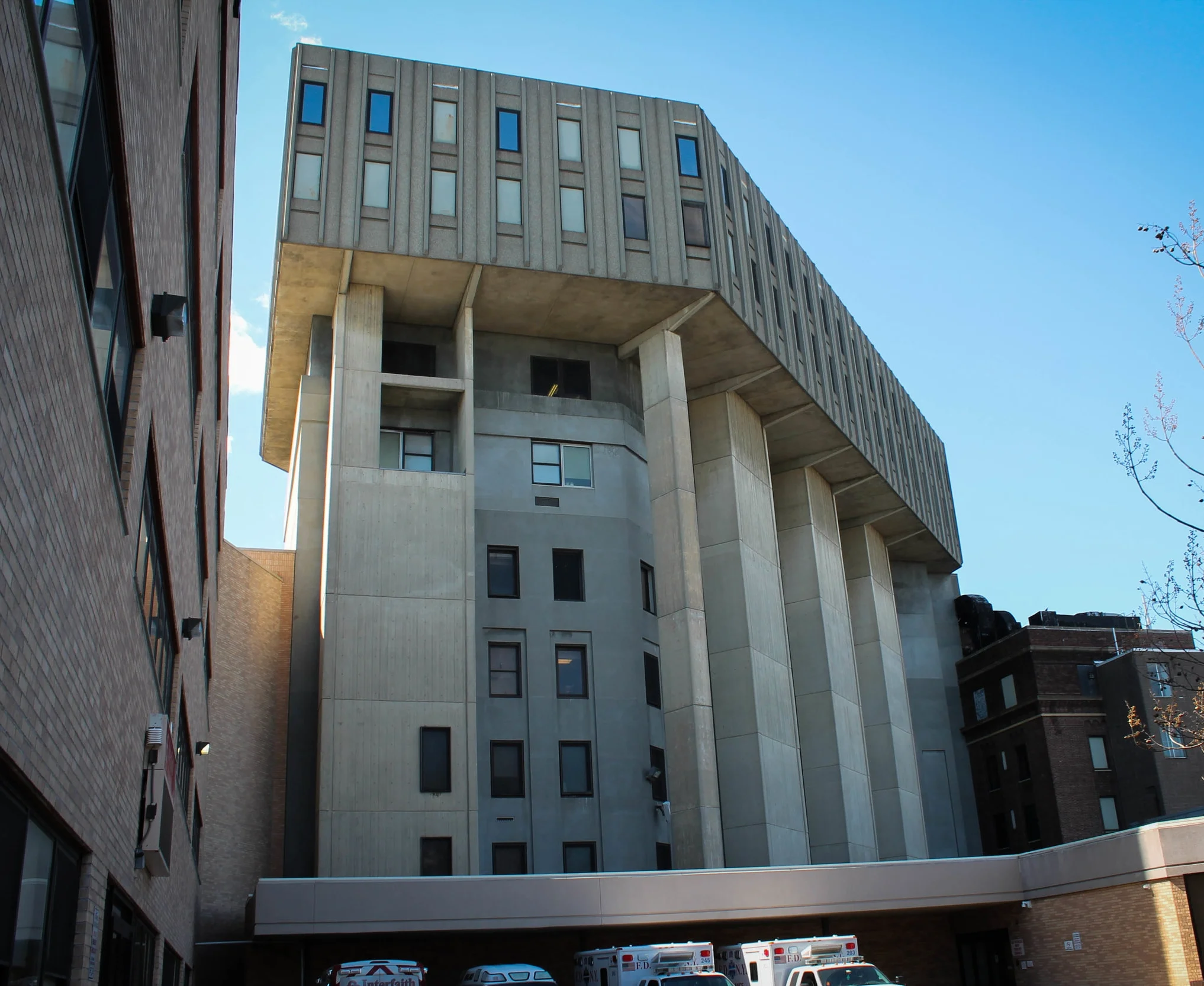Previously St. Josephs Hospital, Interfaith Medical Center is sandwiched between two low-rise brick buildings and the original St. John's Episcopal Hospital and chapel (1927). The complex is located on Atlantic Avenue between Troy and Albany Avenues in the Bedford-Stuyvesant neighborhood of Brooklyn. Interfaith is a result of the 1982 merger of the Brooklyn Jewish Medical Center and St. John's Episcopal Hospital, two hospitals that were struggling financially after the borough saw a drastic population shift to the suburbs in the postwar decades.