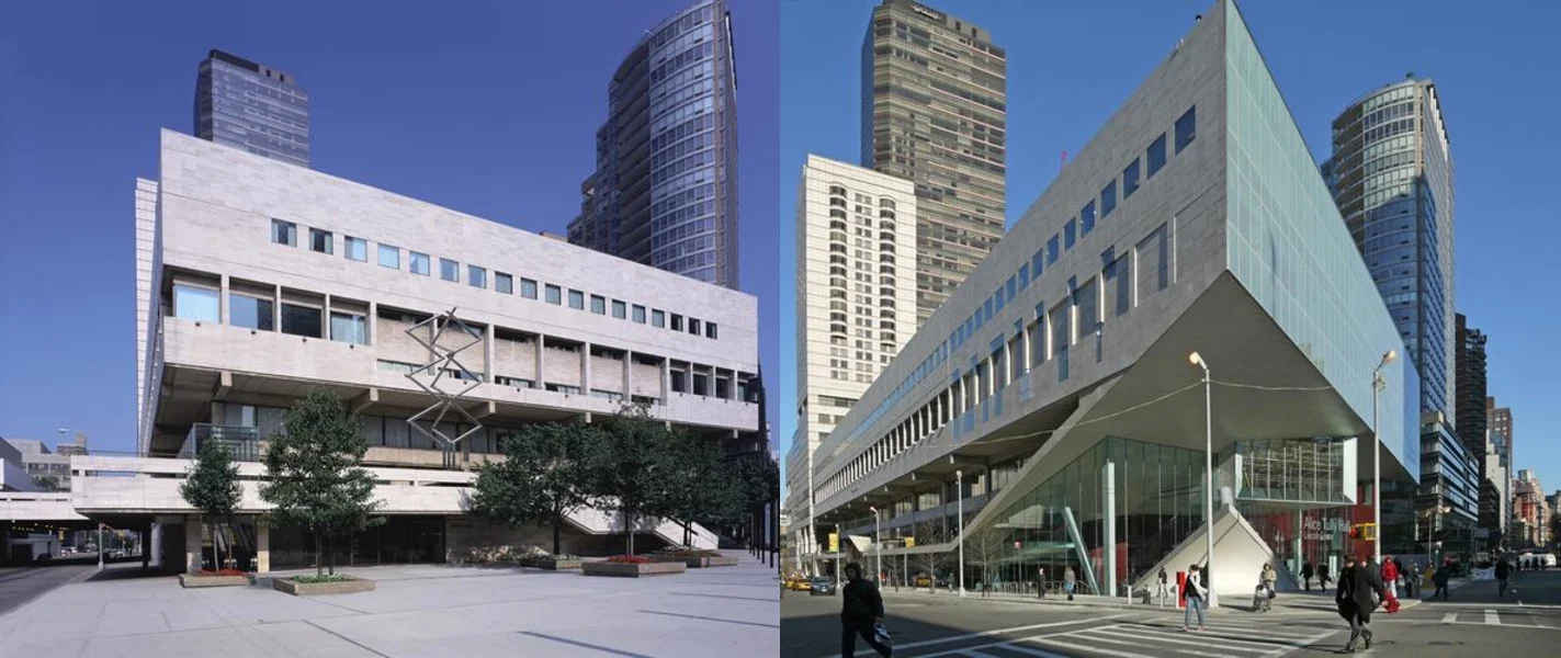 In 2005 a proposal to designate the building a landmark was declined by the Landmarks Preservation Commission and a year later Lincoln Center unveiled a new design for the building. By 2009 the building was redesigned by Diller Scofidio + Renfro with FXFowle, stripping away the travertine front facade and enclosing it in a 48-ft-high glass-fin curtain cantilevered above Broadway, dramatically transforming the entrance, which is unrecognizable from its original design. During the remodel the building was expanded and Alice Tully Hall (now named the Star Theater) was completely redesigned. While travertine still runs the length of the building, the new glass entrance looks like a brand new building. One positive aspect of the design, is it opened up the entrance to the theater and created a new mid-block entrance for Juilliard. Stern had criticized the original entrance to the hall, which was tucked under the exterior staircase with a depressed lobby. Most of the public plaza is also gone, as Belluschi's design was aligned with the rectangular grid, despite the trapezoidal block, creating a triangular plaza along Broadway. The lobby, which almost doubled in size now occupies this space, conforming to the slant of Broadway. Additionally, the monumental staircase on Broadway was removed as was the bridge over 65th Street, which was replaced with a slimmed down version. It is arguable whether the redesign expanded on Belluschi's original concept or radically amputated it.