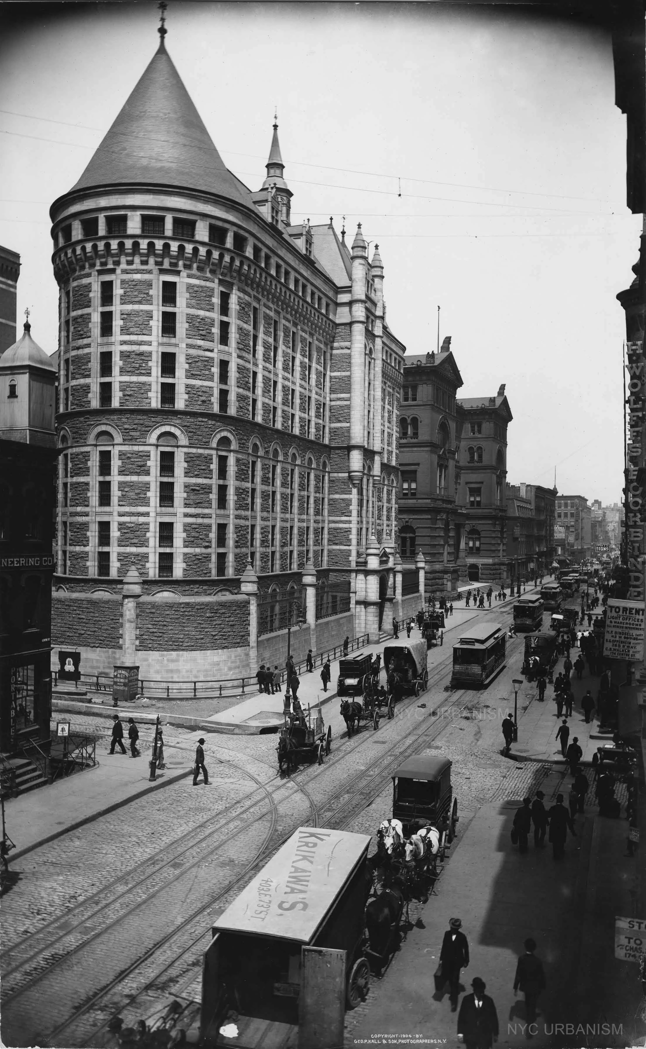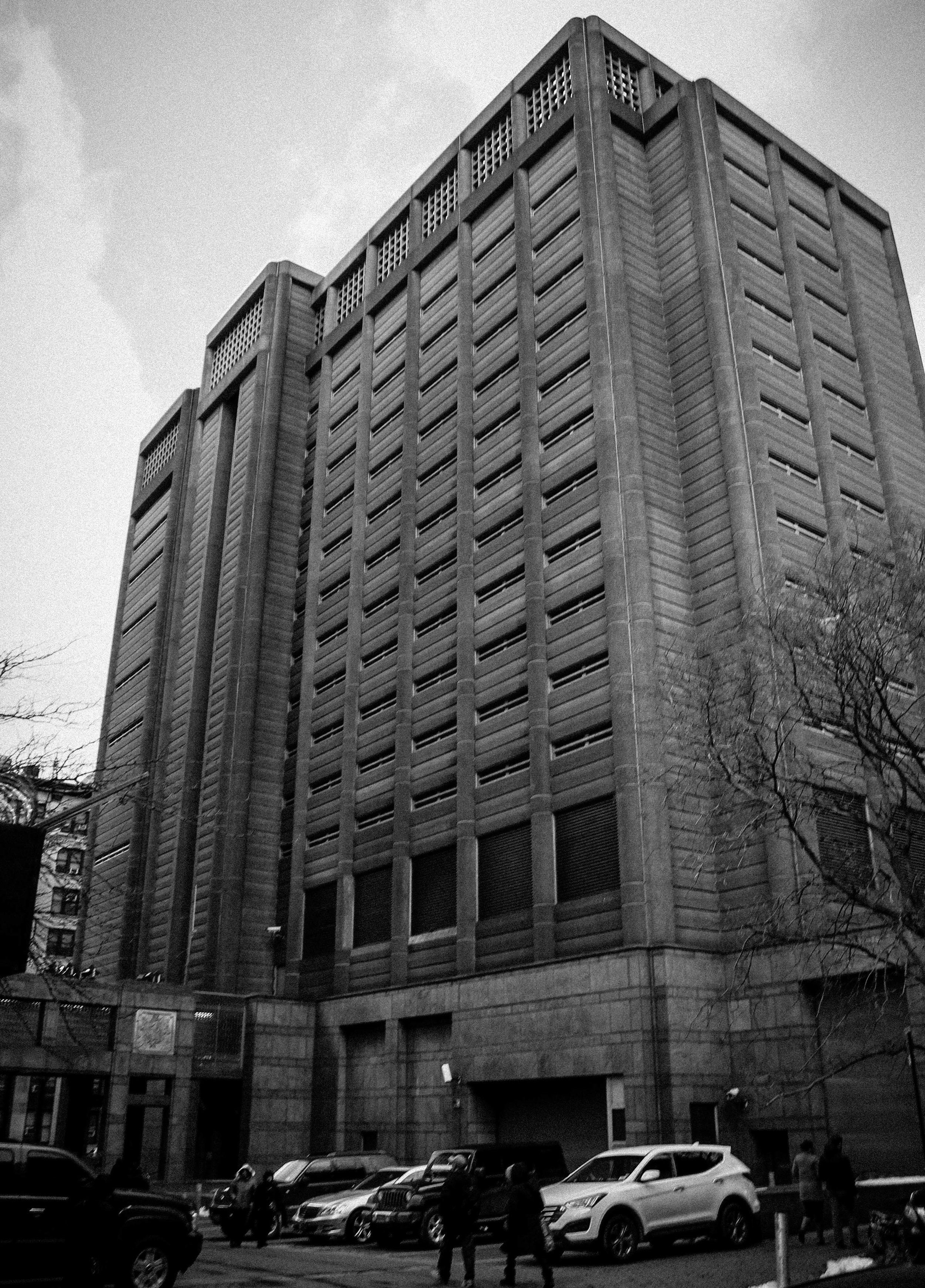 The "Tombs," Manhattan's central booking or Detention Complex as it is officially titled, got its name from the first jail built on this site, which resembled an Egyptian Mausoleum when it opened in 1838. The land was developed in 1817 by filling in the city's original clean water source, Collect Pond. By 1897, the Egyptian Revival "Tombs" was demolished to make way its replacement, located on the west side of Centre Street. The conically roofed, gray structure would open in 1902 and was connected to the courthouse by the infamous "Bridge of Sighs." The old courthouse was demolished and an entire block was cleared on the east side of Centre Street for a new courthouse and jail. In 1942, a modern Art Deco E-shaped high-rise structure with recessed entrances and a ziggurat at its peak, designed by Harvey Wiley Corbett, opened. A freestanding tower, to the north of the complex, connected by an elevated pedestrian "bridge of sighs" became the new "Tombs" city jail. By the 1970s the Tombs had become one of the most notorious jails in the city. Known for its terrible conditions it housed on average 2,000 inmates in a 15-story tower only designed for 925. After a riot in 1974, the Tombs was closed indefinitely when a judge ruled the jail's conditions violated inmates' constitutional rights. In 1983, after a complete remodel, the structure partially re-opened, but due to inmate overcrowding throughout the city, plans were drawn up to build a new extension on the block to the north, bounded by Centre, Baxter, Walker and White Streets.This extension, officially named the Manhattan Detention Complex, was designed by Urbahn Associates and opened in 1990. Despite the official name, and it being the fourth incarnation of the jail, the "Tombs" name stuck.