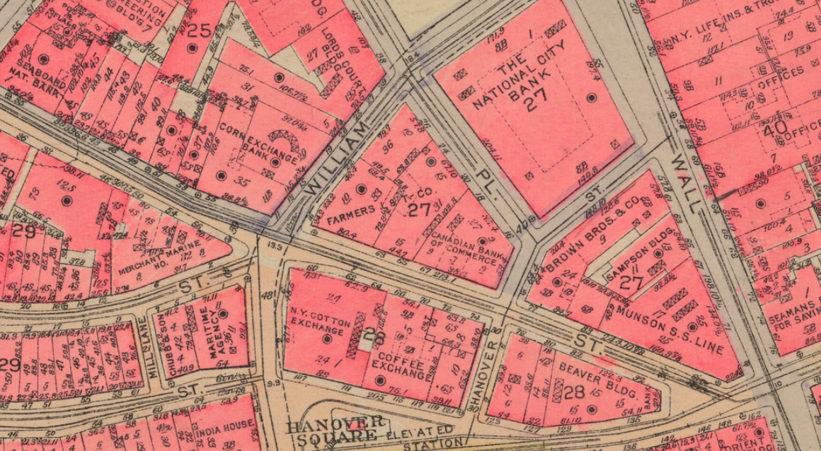 The site of Twenty Exchange Place, bordered by Exchange, William, Beaver and Hanover Street in 1925 before construction started. Farmers L & T and Canadian Bank of Commerce are both seen present occupying buildings on the block, which would be demolished to make way for the skyscraper. The National City Bank at 55 Wall Street is across the street, making it a perfect location for the bank's new headquarters. Bromley Atlas, 1925.