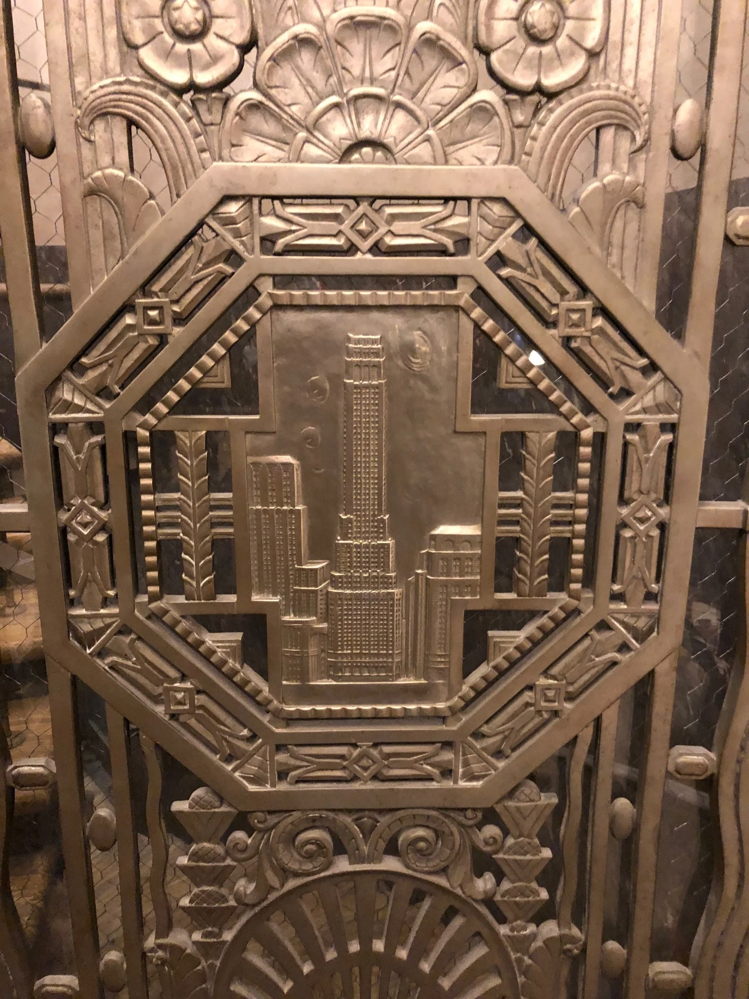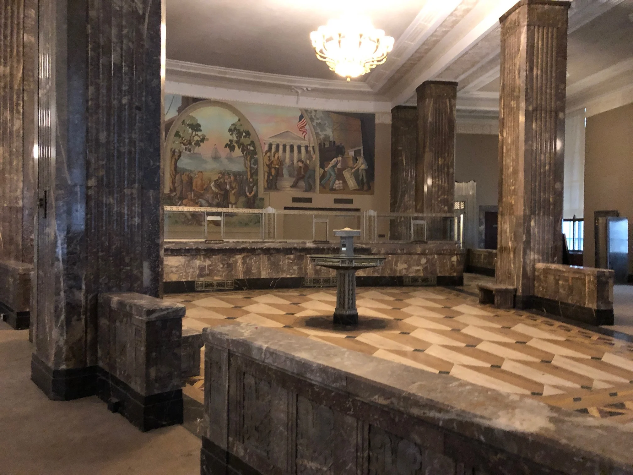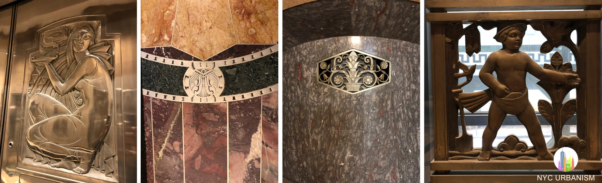 Left: elevator door. Middle left: marble details. Right: babies surrounding the windows in the senior offices depict various scenes.