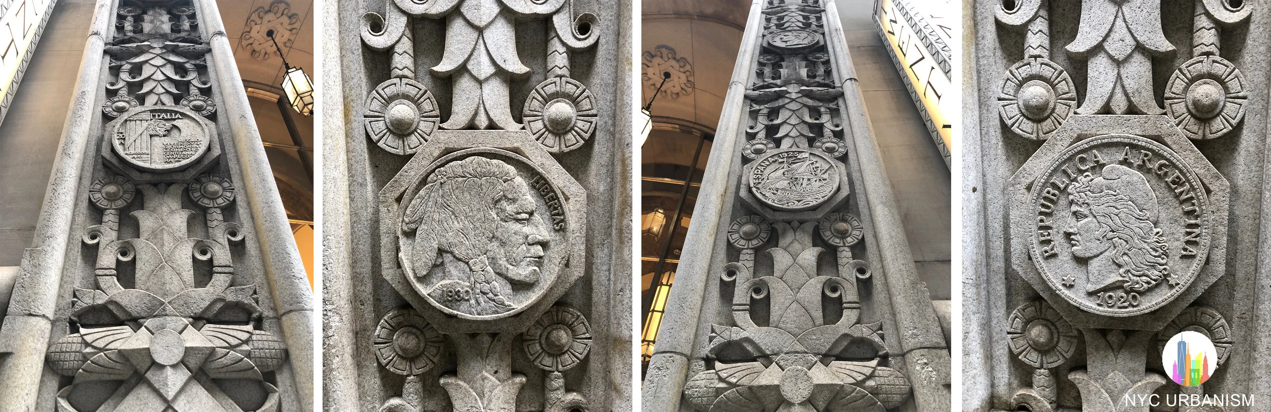 Coins surrounding the entrance depicting countries where the bank had branches.