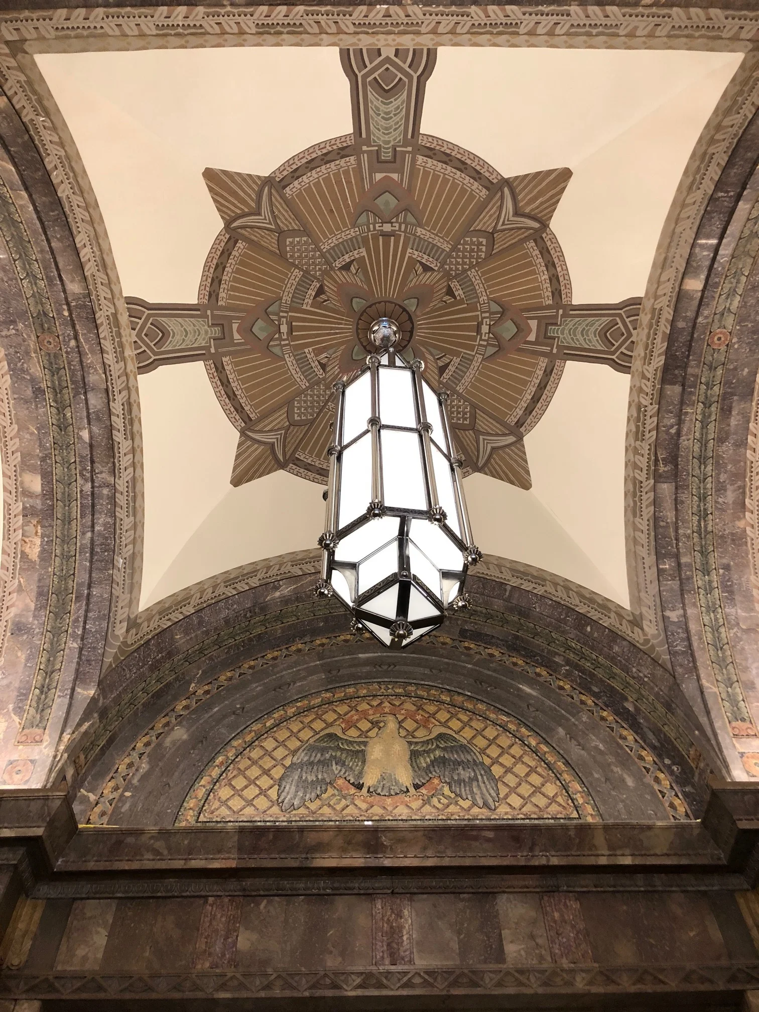 The Exchange Place entrance, in the middle of the block, led to an elaborate marble lobby with colored mosaic panels and elevator banks that access the offices in the tower above.
