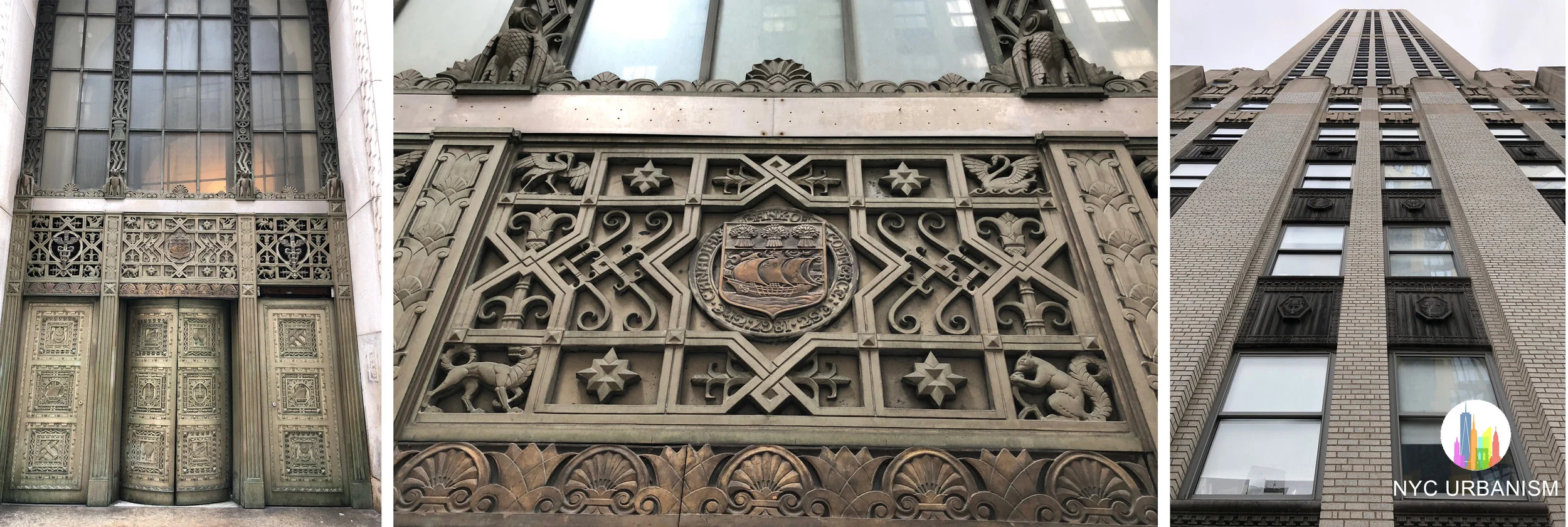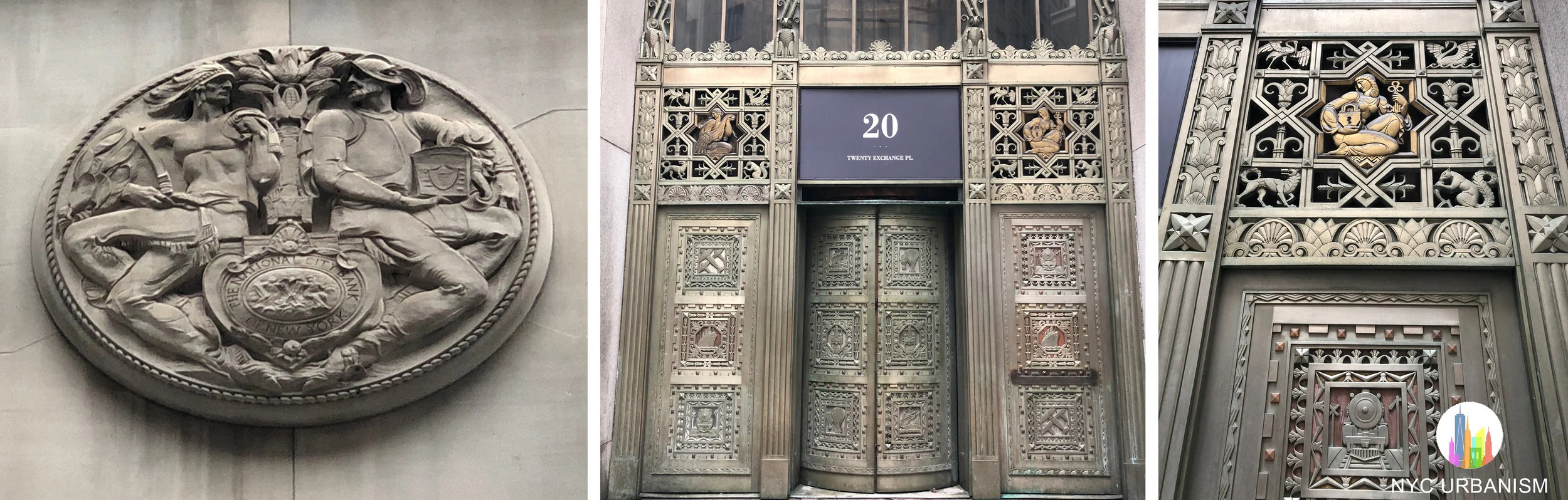 Left: National City Bank of New York logo above the entrance. There is also a seal for Farmers Trust and Loan. Middle: entrance to the original branch and senior offices. The Rotunda is on the other side of this entrance. Right: entrance detail.