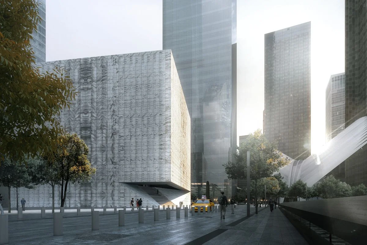 Following the approval of a 99-year lease, construction on the new performing arts center, designed by REX Architecture, has been making steady progress in 2018 with the sub-structure of the lower floors underway and already rising above street level. The building will be covered in a veined white marble, thinly cut to appear translucent when illuminated at night. A stepped entrance to the interior space will direct visitors to the theatres and venues for dance, opera, and musical performances. The building, which follows a 2004 design proposal by Gehry Partners and Snøhetta that was stalled over financing and design issues, has an expected completion date of 2021. The site used to house the former temporary PATH station that was in operation for nearly 10 years following 9/11 while the Oculus was being built. It is also above the third and final segment of the underground roadway that is part of the Vehicle Security Center, which gives access to the sub-basement floors of all the towers at the 16-acre site with its terminus underneath the performing arts center.